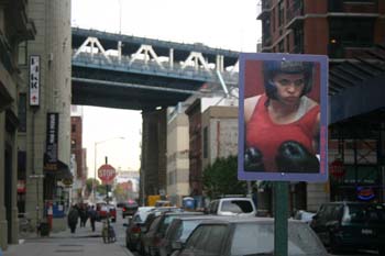 "Sign-Age" is a collaborative public work with Nicole Tschampel installed in October 2004 in the D.U.M.B.O. neighborhood of Brooklyn, NY. The piece consists of eleven industrially manufactured signs, an interactive website, and a paper map that was handed out during the 8th annual D.U.M.B.O. Art Under the Bridge Festival. The signs mimic the format and scale of official traffic signs typically seen in New York streets. They use digital, photographic, and appropriated imagery, and text that calls up memory, fact, and fiction relating to the sites. The website contains a map where visitors can add their own stories, memories, commentary, speculation, or fantasy about the locations or signs.
